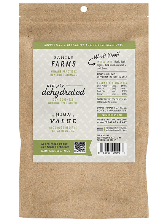 Only the GOOD stuff: Every bag is 100% Duck that is transparently sourced from family farms! With the power of dehydration, we offer your pups treats that are free of salt, sugar, fillers, chemicals, and preservatives!