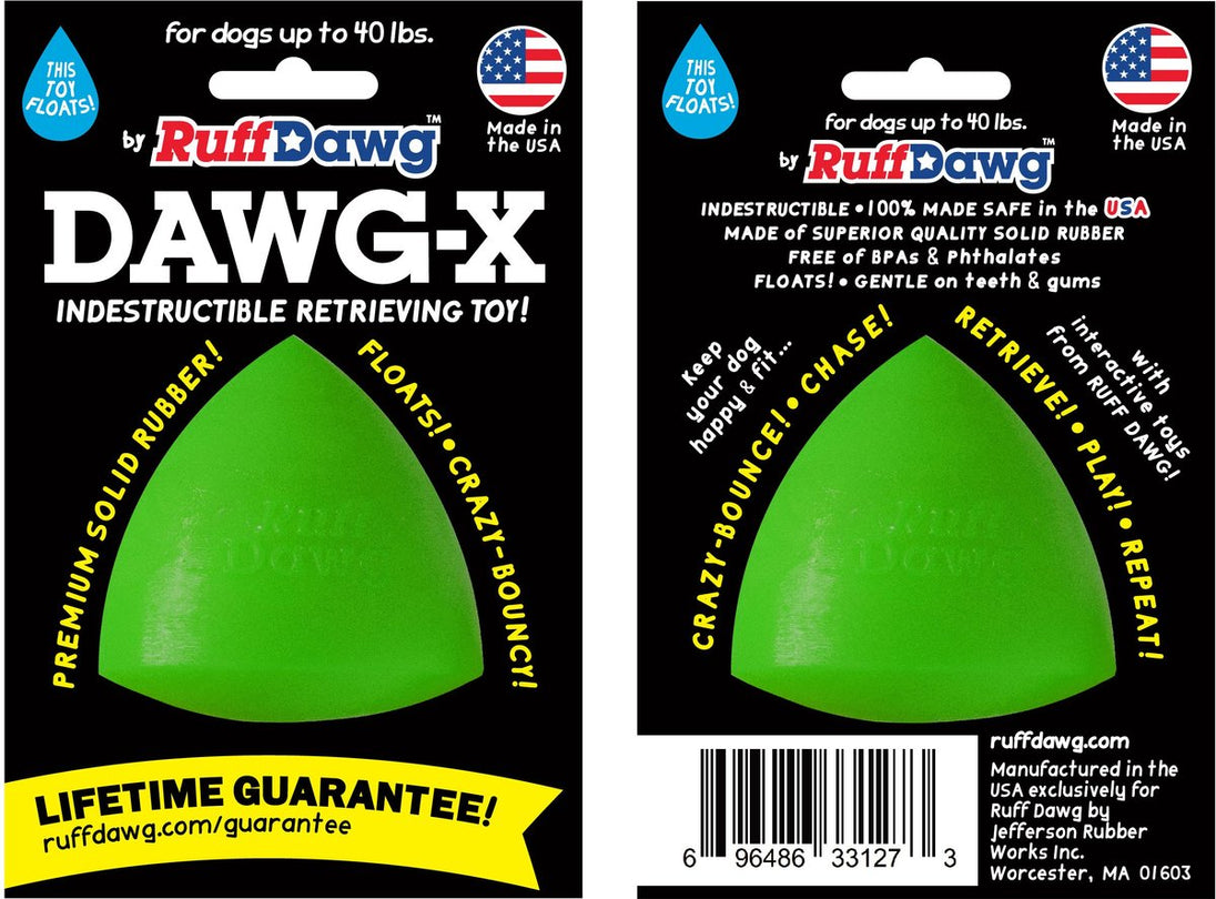 Ruff Dawg Dawg-X is made of solid rubber and shaped in the design of a pyramid to offer up hours of fun. It floats on water, and will bounce in unexpected ways, keeping even the most alert dog on the edge of their paws. They are designed to take serious abuse all while being gentle on teeth and gums, so that play can go on and on.