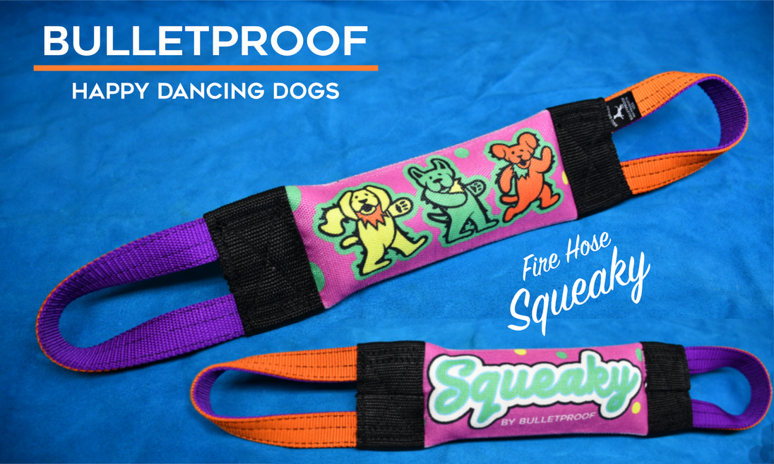 This Happy Dancing Dogs Dog Tug Toy boasts all the durability of our amazing Bulletproof Fire Hose Tugs, with a squeaker inside. The squeak won't be as loud as those annoying squeaky toys you find everywhere online...but it squeaks loud enough for your pup to enjoy it, and they will have fun without it breaking your brain!