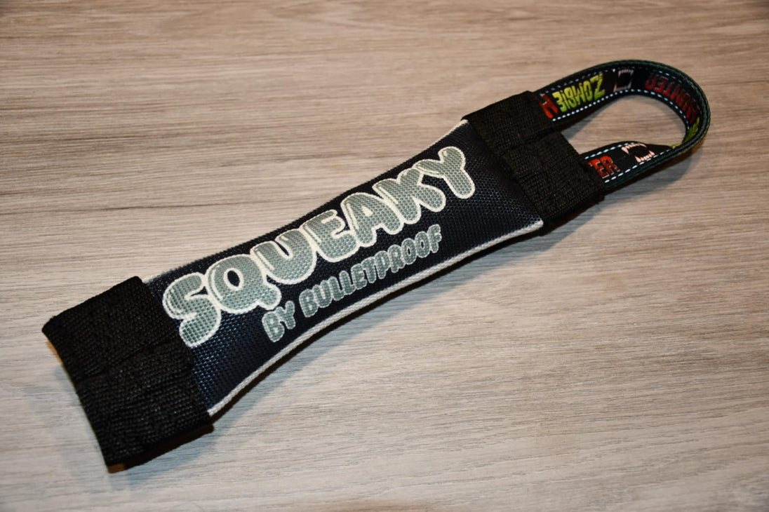 This specially designed Zombie Hunter Fire Hose Tug boasts all the durability of our amazing Bulletproof Fire Hose Tugs, with the bonus of added squeakers. Due to the strength of the Fire Hose material, your dog will have to work extra hard to make it squeak, and the squeak won't be as loud as those annoying squeaky toys you find everywhere online.....But it squeaks loud enough for your pup to enjoy it as you know their hearing is extraordinary. They will have fun without it breaking your brain!!