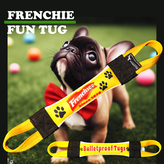 Vendor: Bulletproof Pet Products Inc Frenchie Dog Fire Hose Training Mini Tug (French Bulldog) NEW AND IMPROVED! NOW OUR LOOPS HAVE TWO LAYERS OF WEBBING PROVIDING TWICE THE STRENGTH! Introducing our Frenchie FIRE HOSE TUG. This is one tough tug and it will float. Each tug is made to order, made...Regular price From $45.00