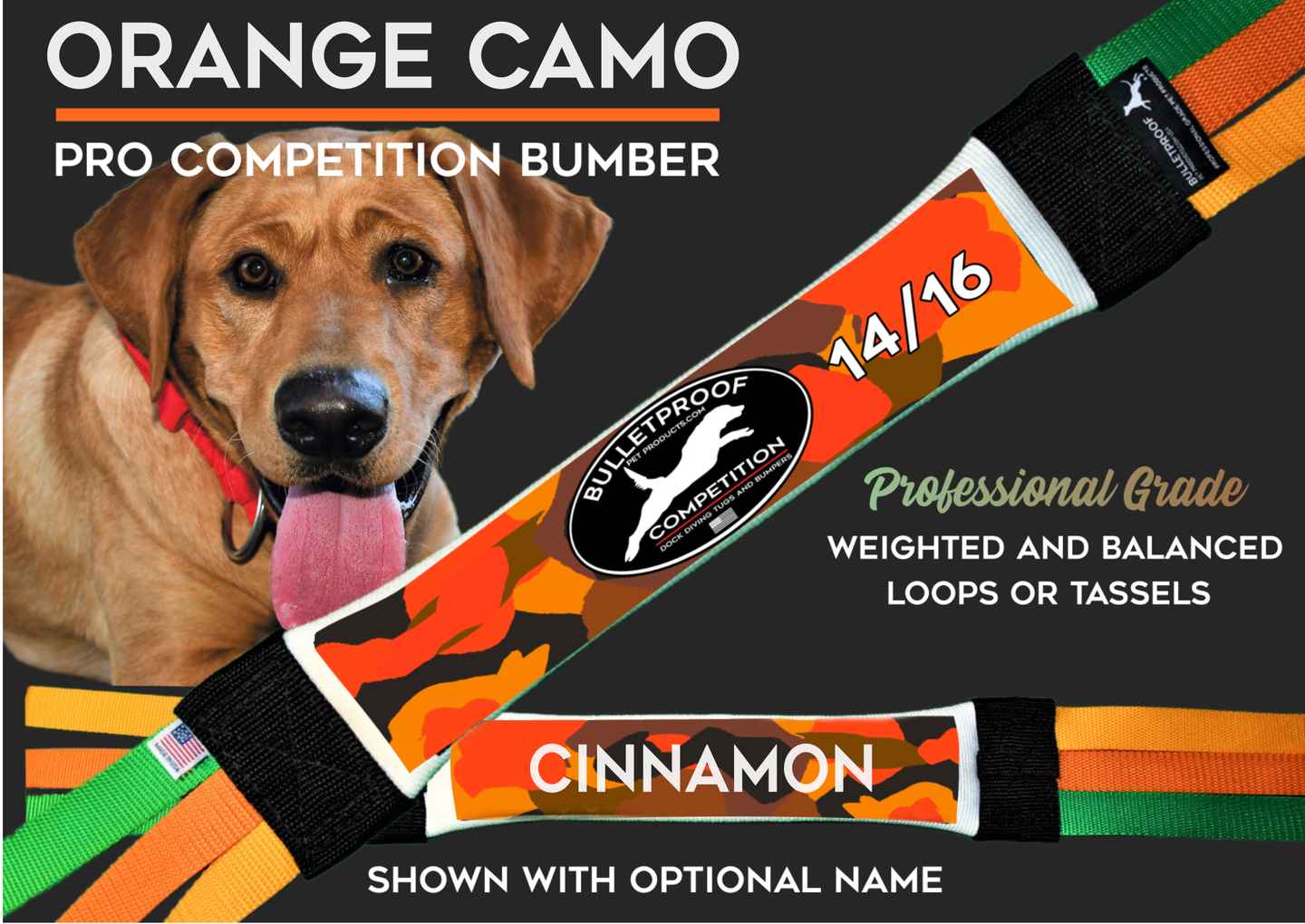 Dock Diving Bumper Tug - Competition Series Weighted - New Orange Camo - Hybrid, Loops OR Tassels