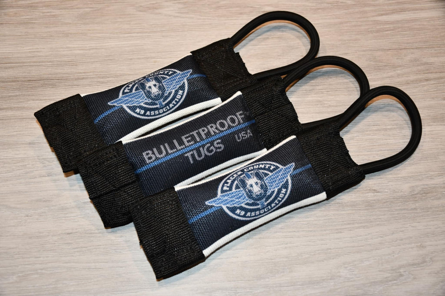 Just what you wanted! A 3-pack of Fire Hose Pocket tugs with you logo on them! You supply the logo and we will personalize them for you. Perfect for K9 handlers with working K9's. These are made with heavy duty 3/8" bungee cord.